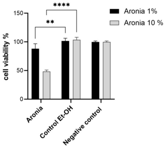 Effect of chokeberry extract on cell viability at concentrations of 1 and 10% compared to controls. Different asterisks represent significant statistical differences (p ≤ 0.05) between samples vs. control, n = 3.