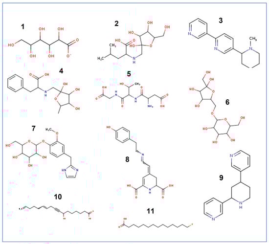 Among the identified sugars, isomaltulose constitutes one of the predominant natural carbohydrates found in honey []. This sugar is often used as an alternative sweetener with low glycemic index properties and has potential prebiotic benefits []. Among the identified alkaloids, anabasamine was previously reported in the seed extract of the Anabasis aphylla plant. Due to its acetylcholinesterase inhibitor effect, this alkaloid could be used for symptomatic treatment of dementia []. A previous study also reported that ZH could contain protein components, even cyclic peptides, with potential medicinal values []. These proteins can be used as a marker for floral origin []. In our case, we report a tripeptide Asp-Thr-Gly, which could be a specific marker for the floral origin of our investigated ZH. Among identified compounds, we noted amino acids and amino acid derivatives, such as Miraxanthin-III, N-(1-Deoxy-1- fructosyl) leucine, and N-(1-Deoxy-1- fructosyl) phenylalanine. Miraxanthin-III was previously reported in several extracts issued from medicinal plants, mainly Ardisia japonica, Ligusticum chuanxiong, Lippia nodiflora, and Mirabilis jalapa [], and was classified as an alkaloid within the amine group. Several in silico studies revealed an interesting application for Miraxanthin-III to treat several diseases. It has been shown that this compound could be a prominent alternative for stroke treatment by interacting and activating neuroglobin []. Another study provided new insight to use Miraxanthin-III to treat Alzheimer disease by inhibiting proteins that are involved in pathogenesis pathways []. This phytocompound could also be used as an alternative treatment for cancer by inhibiting lactate dehydrogenase enzymes leading to decreased cell proliferation and increased sensitivity to chemotherapy agents [].