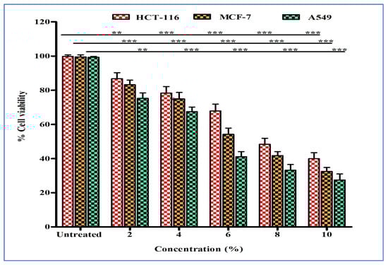 Anticancer activity of honey against A-549, MCF-7, and HCT-116 cancer cells. Error bars indicate SDs (±standard deviation) of three independent experiments. Significance; ** p < 0.01, *** p < 0.001.