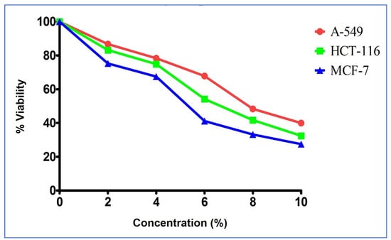 The anticancer activity of ZH was carried out on 3 human cancer cell lines, including lung (A549), breast (MCF-7), and colon (HCT-116) []. The National Centre for Cell Science (NCCS) in Pune, India, provided cell lines for use in this study. Doxorubicin (Sigma, Chennai, India) was used as a reference drug. Cells were firstly grown in (Dulbecco’s Modified Eagle Medium) DMEM (MP Biomedicals, Eschwege, Germany) and 10,000 U/mL penicillin and 5 mg/mL streptomycin antibiotic solution (Hi-Media, Mumbai, India) supplemented with 10% fetal bovine serum (FBS) (MP Biomedicals, Germany), then incubated at 37 °C, 5% CO2, and 80% humidity. After the required growth of cells was obtained, cells were treated in triplicate for 24 h with variable concentrations of ZH diluted in complete media at 2%, 4%, 6%, 8%, and 10%, then washed with phosphate buffered saline (PBS) solution. The cultured cells were treated for 4 h with the prepared MTT (3-(4,5-dimethylthiazolyl-2)-2,5 diphenyl tetrazolium bromide) (MP Biomedicals, Germany) solution (5 mg/mL). The supernatant was removed and 100 μL DMSO (Merck, Darmstadt, Germany) was added to each well. Cell viability was determined by measuring the absorbance at 570 nm (ELISA reader (EL10 A, Biobase, Jinan, China)) and the percentage of viable cells was estimated in order to determine the 50% cytotoxic concentration IC50 values for respective cancer cell lines using the following equation: