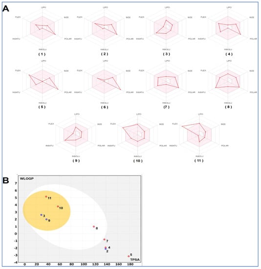 We investigated the drug-likeness properties of identified compounds to assess their potential use for drug development. We concluded that the majority of the identified compounds met Lipinsli’s rule. The only compounds that did not meet this rule were still associated with zero alert. Usually, the absence of toxicophores of alarming chemicals indicates the absence of DNS and/or protein damage [,,]. The bioavailability scores showed that all compounds may be physiologically active. Furthermore, BAS scores showed that oral administration is computationally possible (radar figure). Gastrointestinal (GI) and blood-brain-barrier (BBB) were also assessed. Our findings suggest that half of the identified compounds (3, 8–11) have high GI absorption. Most of the compounds were also predicted to be able to penetrate the BBB. This was confirmed by the boiled-egg model (Figure 3). Only four compounds were found to behave as P-glycoprotein (P-gp) substrates. As cytochrome P450 enzymes (CYP) play a key role in drug metabolism and excretion [,,], the major five CYP isoforms (CYP1A2, CYP2C9, CYP2C19, CYP2D6, and CYP3A4) were assessed. While none of the compounds inhibited CYP2C19, CYP2D6 was predicted to be inhibited by three different compounds (three, nine, and 10). Furthermore, compounds one, two, five–eight, and 11 were predicted to inhibit none of the CYP assessed isoforms. Based on the physico-chemical properties, particularly the lipophilicity and molecular weight, skin permeability was evaluated. It ranged between −4.45 and −11.9, which indicated low to moderate permeability [,].