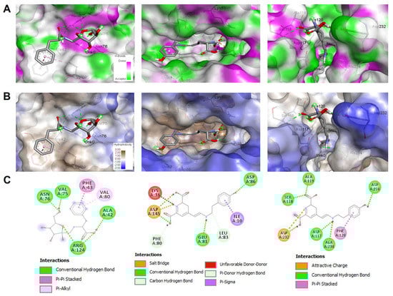 Illustration of 3D H-bonds (A), 3D hydrophobic (B) and 2D diagrams (C) on molecular interactions of the identified compounds in honey and the targeted receptors: 1hd2 (left), adi8 (middle), and 3twj (right), which exhibited the best free-binding energies (−6.6, −8.7 and −8.0 kcal/mol, respectively). The illustrations correspond to the following complexes: 1hd2-compound four, 1di8-compound eight, and 3twj-compound eight.