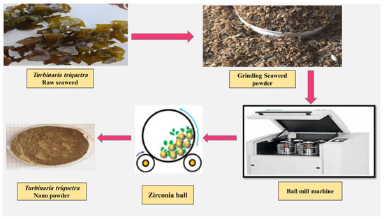 About 2000 g of seaweed material was washed multiple times with tap water to remove the dust and impurities or salts adhered to the outer surface, then finally it was washed with bi-distilled water. The cleaned seaweed was shade dried and powdered in a mixer grinder. The ground seaweeds were ball-milled with a planetary ball mill (Fritsch™ Pulverisette™ 6 Classic Line Planetary Mono Mill, Idar-Oberstein, Germany) with a steel jar of 250 mL volume. Ultrafine grinding was performed by mixing seaweed powder (using 100 g) and three zirconium balls of 10 mm along with two zirconium balls of 25 mm for 25 h, after that two extra zirconium balls of 25 mm were added and the grinding process was continued for an extra 10 h. The milling jar was rotated alternately in the forward or reverse direction at intervals of 2 min while the disk rotated at a speed of 350 rpm. Figure 2 represents the preparation steps of the seaweed nanopowders in the lab.
