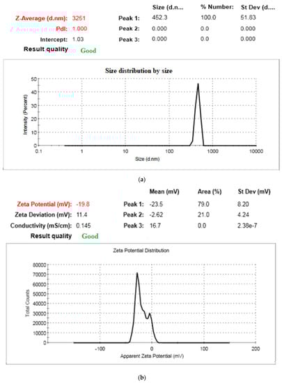 Particle size or size distribution were detected utilizing the dynamic light scattering (DLS) method, which is the most common technique for detecting the size distribution profile of nanopowders (Figure 3a,b). The physiochemical parameters of the T. triquetra nanopowder showed a narrow size distribution and a small diameter (452 ± 20 nm). Zeta potential is a significant measure that represents the stability of the micellar system. It has been reported that under a relatively high surface charge, the particles can repel each other with a strong electrostatic repulsion force, thus enhancing the stability of the system [39]. Zeta potential is a measure of the magnitude of charges on nanopowders; values more positive than +30 mV and more negative than −30 mV demonstrate a strong stability to coalescence. In this test, the T. triquetra nanopowder particle displayed a zeta potential of about −23.5 ± 8.2 mV; hence, the T. triquetra nanopowder particle was stable. Additionally, in another work the authors described NPs with charges in the range of −25 and +25 mV as a sign of stability [40]. The above-mentioned contradictory findings on the relationship between zeta potential and particle size were likely caused by the fact that zeta potential depends on the process and material properties. Zeta potential’s absolute value and positive/negative charge are influenced by the material’s properties, including particle size, concentration, surface characteristics and ionic concentration, as well as by environmental variables such as pH and temperature. In this regard, Rajeshkumar et al., [41] used Turbinaria conoides as a reducing and stabilizing agent during the synthesis of gold nanoparticles since it possesses various natural ingredients, including fucoidan and polyphenolic compounds.