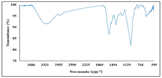 The FT-IR spectral analysis was carried out to identify the potential biomolecules in the crude extract of the seaweed nanopowder. The FT-IR spectra (400–4000 cm−1) of the nanopowder of Turbinaria triquetra showed distinct peaks at different wave numbers (cm−1) which are related to the different functional groups of various chemical ingredients as presented in Table 1 and Figure 4. Generally, the FT-IR results suggested the presence of alkane, alkene, carboxylic acids, alcohols, amines, nitro compounds, phenols and ketones. These results are in harmony with those of various medicinal plants [44,45]. Moreover, the FT-IR results indicated the presence of different functional groups in the nanopowder of Turbinaria triquetra, especially the negatively charged groups such as O-H, N-O and C=O; these groups explain the negative charge of zeta potential (about −23.5 ± 8.2 mV) of these nanoparticles. The biomolecules found in the marine brown seaweed Turbinaria triquetra had a variety of chemical bonds and functional groups according to FT-IR spectrum research. The FTIR results showed that the compounds present in the marine brown seaweed Turbinaria triquetra were aromatic, alkanes, amides or amines and may function as potential stabilizers of nanoparticles in aqueous media. These findings are well supported by the literature [46].