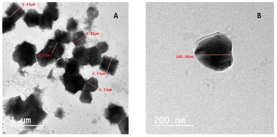 TEM were utilized to observe the particle size and shape of nanopowders. TEM detection using low and high resolution power displayed the output of hexagonal nano-seaweed with particle sizes between 180 and 450 nm, as shown in Figure 6A,B.