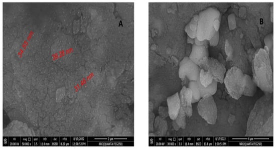 The SEM micrographs of the prepared material are presented in Figure 7A,B. The prepared material exhibited an irregular particle shape without the formation of any bulky crystals. Moreover, the particles were agglomerated with non-uniform dimension. More importantly, nanopowders of seaweed can clearly be seen as shining dots on the external surface of the prepared material. The length of these nanopowders was measured to be in the range of 30–40 nm.