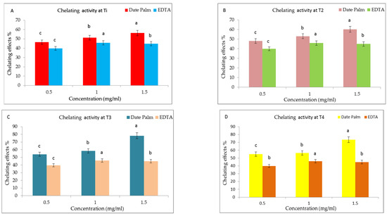Ferric reducing chelating activity of each treatment was assessed according to the previously described method [35]. Three milliliters from each extract at various concentrations, (0.5, 1 and 1.5 mg/mL) of ethanolic date palm extract were added to 60 µL of FeSO4 (2 mM). The reaction was started by adding 100 µL of ferrozine (5 mM). The mixture was mixed well or allowed to stand at room temperature for 10 min. Absorbance of the mixture was measured at 562 nm. Ethylenediaminetetraacetic acid (EDTA) was utilized as a positive control. The IC50 value (mg/mL), which is the concentration of the extracts that chelates 50% of the ferrous ion, was calculated from the nonlinear regression curve.