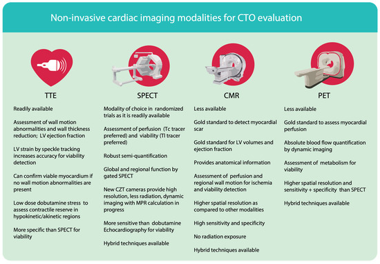 Non-invasive cardiac imaging modalities for CTO evaluation CTO–chronic total occlusion, TTE–transthoracic echocardiography, SPECT–single positron emission computer tomography, CMR–cardiac magnetic resonance, PET–positron emission tomography, LV–left ventricle, Tc–technetium, Tl–thallium.