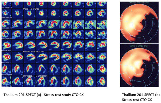 Supported by robust evidence, viability has a pivotal role in predicting short and long-term revascularization benefits. In patients with extended scarring in the CTO region, revascularization benefits are not warranted, while in those with smaller regional defects, the extent of viability could be interpreted along with angiographic information, to finally derive the binary labels of significant viability vs. non-viable CTO region. CMR delivers more accurate information in this context, as it can quantify both the regional extent and thickness of LGE enhancement. SPECT imaging for viability and ischemia is widely accessible and affordable; new CZT cameras and adapted protocols expose patients to less radiation. Thallium-201 SPECT rest-redistribution imaging provides better viability assessment compared to technetium-99 m stress-rest SPECT; in case of doubt, FDG-PET might be performed additionally. In the same manner, ischemia can be underestimated in some cases in the classic segmental semi-quantification (Figure 5). However, given significantly large ischemia, viability, and no confounders to disintegrate SPECT imaging, the indication to undergo CTO PCI remains uncomplicated. On the other hand, PET imaging is a newer method, but less accessible. Due to the possibility of metabolic and perfusion imaging, as well as being a gold standard for myocardial blood flow quantification, PET is a more accurate method for the evaluation of ischemia and viability [91].