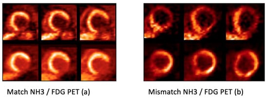 Combined perfusion (performed with N-13 ammonia) and metabolism (performed with F-18 FDG) PET study allows a differentiation between viable and non-viable myocardium. On the left side (a) is shown a perfusion/metabolism match in the posterior-lateral segments with equally reduced NH3 (top) and FDG (bottom) uptake reflecting scar in this myocardial region. On the right side (b) a perfusion/metabolism mismatch: perfusion (short axis views at the top) and metabolism (short axis views on the bottom) with reduced NH3 uptake and enhanced FDG uptake in the lateral wall. This reflects preserved viability in the hypo-perfused lateral myocardial segments.