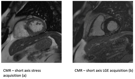 Cardiac magnetic resonance stress acquisition on a short axis view (a) with a reduced contrast uptake in posterior-septal segments. (a) On the right side (b) a late gadolinium enhancement in subendocardial posterior-lateral myocardial segments shows significant preserved viability (<50% trans-murality).