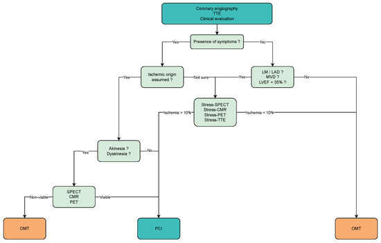 Workflow for clinical indication of CTO PCI, TTE—trans-thoracic echocardiography; LM—left main coronary artery; LAD—left anterior descending coronary artery; LVEF—left ventricular ejection fraction; SPECT—single photon emission computer tomography; CMR—cardiac magnetic resonance; PET—positron emission tomography; OMT—optimal medical therapy; PCI—percutaneous coronary intervention.