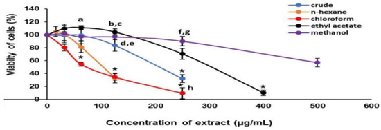 Effect of Parkia speciosa empty pod crude extract and fractions on H9c2 cardiomyocyte viability. The data are expressed as means ± SEM (n = 3). * p < 0.05 compared to control (0 µg/mL), a p < 0.05 compared to chloroform 62.5 µg/mL, b p < 0.05 compared to chloroform 125 µg/mL, c p < 0.05 compared to n-hexane 125 µg/mL, d p < 0.05 compared to chloroform 125 µg/mL, e p < 0.05 compared to n-hexane 125 µg/mL, f p < 0.05 compared to chloroform 250 µg/mL, g p < 0.05 compared to crude 250 µg/mL, h p < 0.05 compared to chloroform 250 µg/mL.