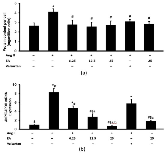 Effects of the EA fraction (µg/mL) of P. speciosa and valsartan (20 µM) on (a) protein content per cell (mg/million cells) and (b) ANP/GAPDH mRNA expression in Ang II-induced cardiomyocyte hypertrophy. Data are expressed as means ± SEM (n = 3). * p < 0.05 compared to control, # p < 0.05 compared to Ang II, $ p < 0.05 compared to valsartan + Ang II, a p < 0.05 compared to 6.25 µg/mL EA + Ang II, b p < 0.05 compared to 12.5 µg/mL EA + Ang II.