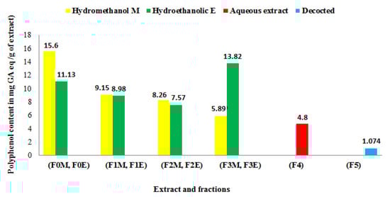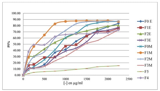 Based on the data, we can see that the ability of the various extracts investigated to decrease iron varies; the aqueous fraction (F3E) and the aqueous ex-tract (F4) have the highest CE50 = 0.33 mg/ml, followed by the residual fraction (F3M) and the decoc-tion, which have an EC50 capacity = 0.4 mg/ml. Therefore, all extracts have some iron-reducing capacity, but not as much as ascorbic acid (EC50 = 0.07 mg/mL).