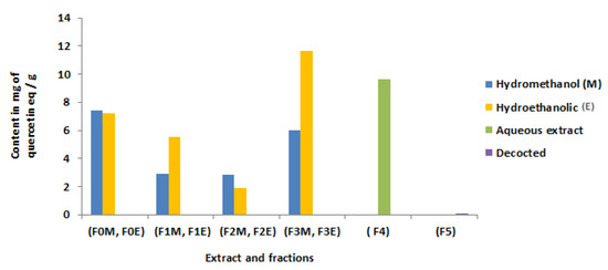 The flavonoid contents are measured using aluminum trichloride [28], the latter forms with the flavonoids a yellow complex which absorbs in the visible at 433 nm. The blank is produced by replacing the extract with methanol and the absorbance is measured at 433 nm. 2 µL of each extract is mixed with 10 µL of 10% (m/v) aluminum trichloride (AlCl3), followed by 2 mL of distilled water and 3 mL of pure methanol. After 30 min incubation at room temperature, absorbance is determined at 433 nm using a UV spectrophotometer against a blank. A calibration curve is produced in parallel under the same operating conditions using quercetin as a positive control. The flavonoid content of the different fractions are expressed in milligrams (mg) the equivalent of quercetin per gram of dry plant matter (mg EQ/g). The flavonoids content is calculated using the formula: