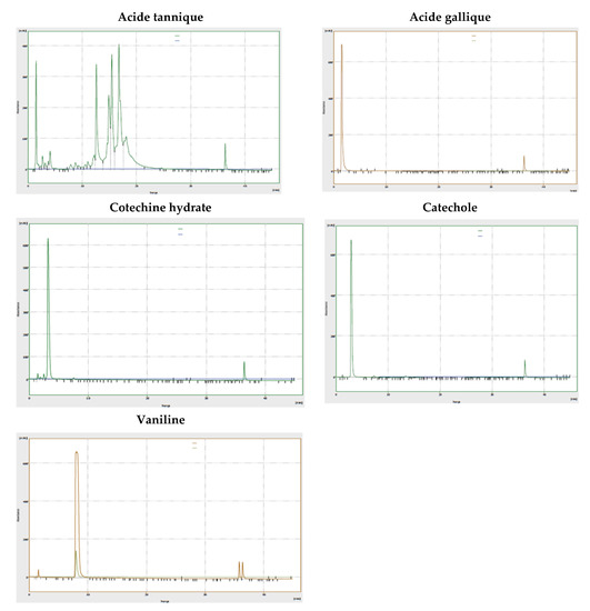 In order to conduct a chromatographic analysis of the polyphenolic extracts of the plant under study, we used a Waters HPLC e2695 (Milford, MA, USA) with a UV/Vis detector. The dimensions of the column utilized are 5 m × 250 mm × 4.6 mm; it is a C18 reverse phase column. When eluting molecules, a combination of water/acetic acid (2% v/v) (A) and acetonitrile, pH = 2.6, is used as the mobile phase (B). This experiment’s solvent gradient goes as follows: 2% acetonitrile (isocratic) 0–3 min, 2% acetonitrile in ace-tic acid (linear gradient) 3–19 min, 30% acetonitrile in acetic acid (linear gradient) 19–23 min, 80% acetonitrile in acetic phosphoric acid (isocratic) 23–28 min, 80% acetonitrile in acetic One milliliter per minute is the current rate of flow. Ten microliters (L) of injection volume. A diode array detector was used for the detection, and its spectral response was optimized for the region of 280–360 nm. Gallic acid, lecatechol, vanillic acid, catechin, tannic acid, rosmarinic acid, naringenin, coumarinic acid, and naringenin are used as reference points. The retention periods of the various peaks of the extracts are compared to the retention times of the peaks corresponding to the standards, allowing for an analysis of the eluted chemicals.
