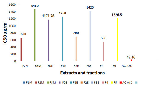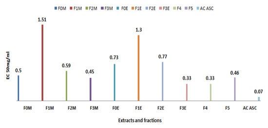 The antioxidant capacity of the different extracts is expressed by determining the effective concentration (EC50) which corresponds to an absorbance equal to 0.5 in order to compare their reducing activities. The values are shown in Figure 14.
