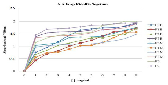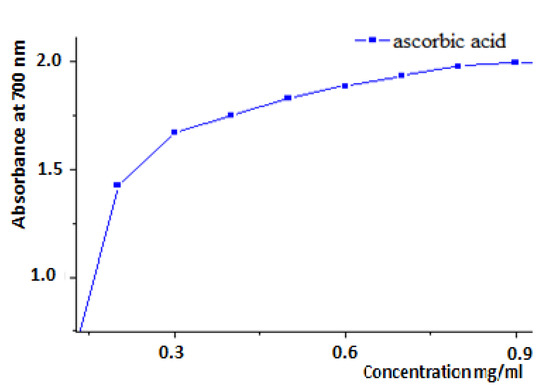 Each extract was combined with a 0.2 M phosphate buffer solution (pH = 6.6) and a 1% solution of potassium ferricyanide K3Fe (CN) 6 in a total volume of 5.0 mL. The whole solution was put into a water bath at 50 degrees Celsius for 20 min. After adding 2.5 mL of 10% trichloroacetic acid to halt the reaction and centrifuging the tubes at 3000 rpm for 10 min, the resulting supernatant is mixed with 2.5 mL of distilled water and 0.5 mL of an aqueous 0.1% FeCl3 solution. At 700 nm, the reaction medium absorbance is measured against a blank in which the extract has been replaced by distilled water. A standard antioxidant solution, ascorbic acid, was used as the positive control, with its absorbance measured in the same way as the samples. If the extracts’ absorbance increases, it means they have more reducing power [34,35].