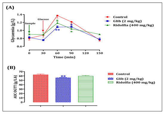 Variation in postprandial glycemia (A) and area under the postprandial glycemia curve (B) in normal rats after administration of the test products (decoction and glibenclamide). Values are means ± SEM. (n = 6). ** p < 0.01; * p < 0.05: in comparison with the control.