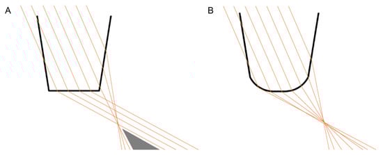 A sharp-edge design of IOL optic was recognized as a contributing factor for PD development (Figure 1A) [11,12,15]. In a ray-tracing analysis, Holladay et al. showed that a sharp-edge IOL design increases the probability of a thin, ring-like image projecting onto the midperipheral retina [15]. The same study showed reduced probability of PD by dispersing the reflected rays with rounded-edge IOL design (Figure 1B) [15]. However, sharp-edged IOLs are still commonly in use, as they slow down posterior capsule fibrosis [21]. Meacock et al. suggested using square-edge IOL with a textured edge to prevent unwanted glare symptoms [22]. However, a study by Franchini et al. did not show any significant decrease in PD incidence by using square-edge IOLs with frosted edge [23]. Moreover, the use of such IOLs could result in decreased contrast sensitivity [23].