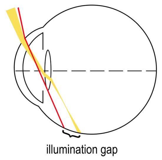 The most supported working theory for temporal visual field shadow occurrence in pseudophakic patients with ND is the illumination gap of the nasal retina [34]. The illumination gap is caused by different refraction of rays that hit the IOL optic periphery to those that miss the IOL (Figure 3) [3,7,34]. The illumination gap is bounded posteriorly by the rays refracting on IOL optic periphery and anteriorly by the rays missing the IOL which are not refracted [7,34,37]. The location of the illumination gap usually corelates well with the ND symptoms described by patients [3,7,34].