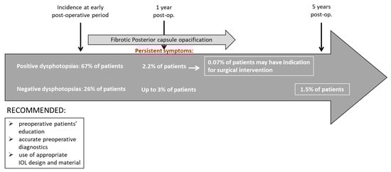 Both, PD and ND can occur separately or as a combination of both [11]. Postoperatively, the spontaneous opacification of the nasal capsule leads to spontaneous resolution of ND (diffuser effect) [66,67,68,69], while posterior capsule opacification causes light scatter, thus reducing retinal contrast and threshold sensitivity [70]. Capsular bag contraction can cause anterior axial movement of the IOL, reducing the axial space behind the iris, which could also be the reason for dysphotopsias [7]. The symptoms PD and ND cause are usually transient symptoms, thus the first-line measures alleviating them involve patient education, counseling, and noninvasive approaches [5]. A time course of dysphotopsia symptom persistence is presented in Figure 4.