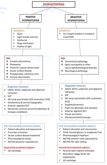PD symptoms can resolve by correcting any postoperative refractive error, treating coexisting ocular surface diseases (e.g., dry eye syndrome), treating posterior capsular opacification, or by inducing pharmacological miosis [8,71,72]. Any corneal abnormalities should be examined, including sequels of previous refractive surgery, presence of epithelial basement membrane disease, or microcystic oedema. Diagnostic measures should include measuring uncorrected distance visual acuity (UDVA), uncorrected near visual acuity (UNVA), distance corrected visual acuity (DCVA), distance corrected near visual acuity (DCNVA), subjective and objective spherical equivalent refraction, monocular contrast sensitivity testing, intraocular pressure (IOP) measurement, and slit-lamp examination [10,57]. Diagnostic imaging should include keratometry, corneal topography, and anterior segment OCT [10]. A flowchart showing the course of treatment of a patient with dysphotopsia is presented in Figure 5.