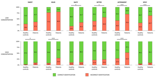 Proportions of correct and incorrect identifications of different types of taste stimuli among healthy controls and patients. Statistically significant differences in proportion in correct identification between the patients and healthy controls are marked with asterisks. * means p < 0.05 while *** p ≤ 0.001.