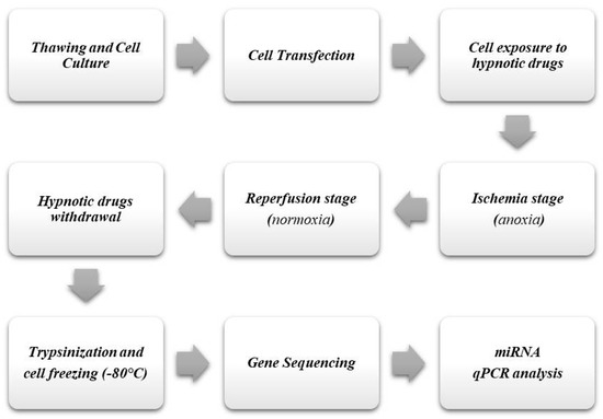 A schematic summary of the experimental design is shown in Figure 1. In brief, this protocol required primary human cardiomyocytes (HCMs) to be thawed, cultured under standard conditions (O2 21%, CO2 5%, 37 °C), and transfected (PromoCell®, Heidelberg, Germany). Secondly, transfected cells were exposed to hypnotic drugs (e.g., propofol or sevoflurane), adding them to the culture medium. Thirdly, the cells were cultured under anoxic conditions (O2 concentration 0%) in a hypoxic chamber to simulate the ischemia process. Next, a reperfusion stage was carried out, culturing the cells under standard conditions. Ischemia and reperfusion processes were performed with HCMs exposed to hypnotic drugs. Once the reperfusion stage was finished, the hypnotic drugs were withdrawn from the culture medium and the cells were cultured under standard conditions for their stabilization.
