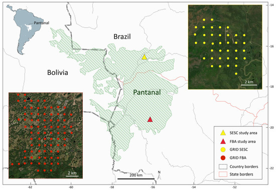 Geographical location of study areas in the northern (SESC) and southern (FBA) Pantanal with grid shapes and camera trap stations (dots) (SESC = 37, FBA = 80). Map source: GGIS 3.12.1; Pantanal shape file source: Bioscience, An Ecoregions-Based Approach to Protecting Half the Terrestrial Realm.