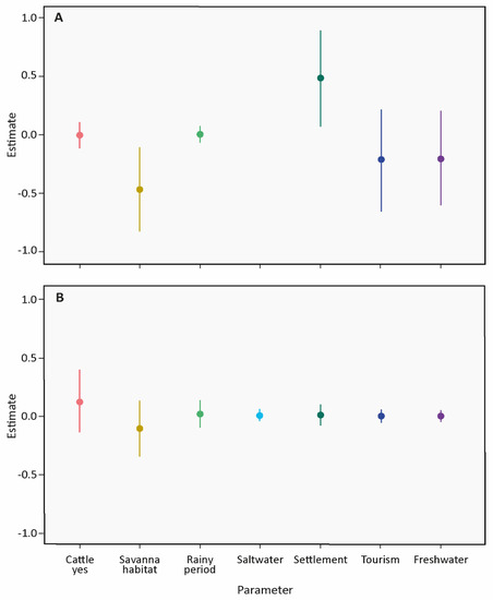 To assess the potential impact of anthropogenic and environmental factors in both study areas, (1) the occurring habitat at each camera trap site was determined and roughly categorized into forest or savanna habitat [81], (2) the presence or absence of cattle at each camera trap site was estimated based on camera trap data, (3) each sample was categorized as taken during the dry period (April to September) or rainy period (October to March) [92], and the linear distance of each camera trap site to the next (4) dirt road or trail used for tourism, (5) small settlement, (6) permanent freshwater lake, and (7) saltwater lake (only FBA) was measured. All distance measures were conducted using QGIS (vers. 3.12.) (QGIS Development Team 2020).