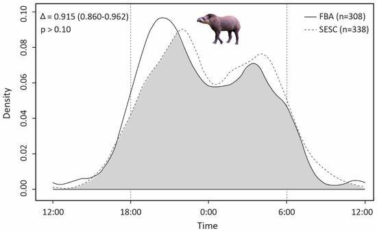 Activity levels were similar in both study areas (difference: −0.031; Wald test: 0.335 p-value: 0.563), with a level of 0.462 (SE = 0.039) for SESC and 0.431 (SE = 0.038) for FBA. The activity patterns of both areas indicated a very high overlap and did not significantly differ (Figure 3). In both study areas, tapirs were predominantly nocturnal and largely inactive between approximately between 7 am and 16 pm, with the lowest activity around noon. In both study areas, a strong increase in activity after approximately 17 pm was observed, reaching its peak of activity around 22 pm at SESC and between 20 and 21 pm at FBA. In both areas, activity declined toward midnight and increased after 1 am or 2 am, reaching a smaller peak at approximately 4 am and between 3 and 4 am, respectively. After 4 am, the activity decreased in both areas.