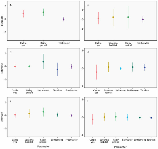 Averaged parameter estimates and corresponding 95% confidence intervals (CI) of generalized linear mixed models (GLMMs) assessing the effect of distinct factors on the probability of activity of tapirs in the two study areas SESC (left panel) and FBA (right panel). (A,B): probability of nocturnal activity (nocturnal: 18:00–05:59 h, diurnal: 6:00–17:59 h), (C,D): probability of high nocturnal activity strict (nocturnal records separated into hours with high and low activity), (E,F): probability of high nocturnal activity lax (crepuscular and nocturnal records (17:00–06:59 h) separated into hours with high and low activity). Factors included in the analysis: habitat at camera trap site (forest, savanna); cattle presence at camera trap site (no, yes); period during the camera trap sample (dry, rainy); and distance of camera trap site to the next freshwater lake, settlement, saltwater lake (only FBA), or dirt roads or trails used for tourism. Random effects, camera trap site ID and sample ID were included in all models.