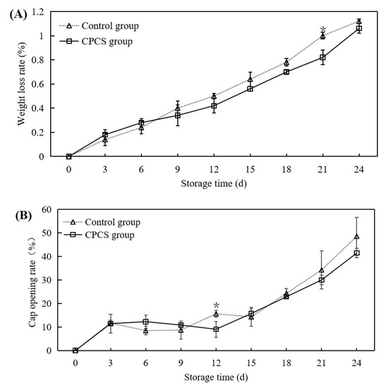 Effects of CPCS on weight loss (A), the cap opening rate (B), and stem elongation (C) of F. velutipes during cold storage. ‘*’ indicated the significant differences (p < 0.05) between two treatments on each sampling day.