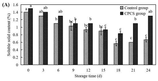 After harvesting, F. velutipes constantly consumes its own stored nutrients, and the consumption of sugars provides energy for the respiration of F. velutipes. However, the degradation of carbohydrates promotes fibrous deterioration of substrates and causes deterioration of the flavor of F. velutipes. Vitamin C is an important nutrient in mushrooms, and in general, the vitamin content of F. velutipes decreases with the storage time [23]. The soluble solid content and the vitamin C content are indicators in F. velutipes that reflect changes in its nutrients. The soluble solid contents of the two treatments showed a decreasing trend first and then an increasing trend, as the soluble solid content of the CPCS group was higher than that of the control group (Figure 3A). On the 18th day of storage, the soluble solid contents of both groups decreased to the lowest level, which were 0.57 ± 0.06% in the control and 0.83 ± 0.05% in the CPCS group. The soluble solid contents in the two groups then gradually increased, with the CPCS group’s content being double that of the control group at the end of the storage period. During storage, the rate of change in the vitamin C content in the control group was faster than that of the CPCS group (Figure 3B). During the 6th to 12th days of storage, the vitamin C content in the CPCS group was significantly higher than that of the control group (p < 0.05). In summary, CPCS-treated F. velutipes can effectively delay the loss of soluble solids and vitamin C. However, the mechanisms affecting the elevated soluble solid content of F. velutipes in the later stages of storage need to be further investigated in subsequent studies.