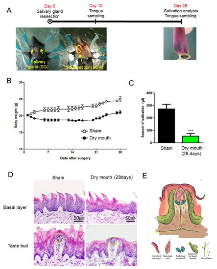 Validation of induction of dry mouth after salivary gland resection (SGR). (A) The wild-type and TRPV1-knockout mice were randomly distributed into two groups of eight animals each: the sham and SGR groups. The salivary glands of the mice were removed in the SGR group. To exclude the effects of incision and anesthesia, the sham group was performed only after incision. (B) After surgery, the body weight of the mice was measured for 5 weeks. The body weight of the SGR group mice was not higher than that of the sham group mice. (C) The saliva volume of the mice was measured at 4 weeks after surgery. To induce salivation in each mouse, 0.3 mg/kg pilocarpine was intraperitoneally administered at 3 min after the mice were anesthetized. The secreted saliva was collected with natural flow into tubes for 10 min. The values have been provided in terms of mean ± standard error of mean (SEM). *** p < 0.001. (D) The anterior tongue was removed at 10 days after SGR. Subsequently, H&E staining demonstrated that the morphological features of the basal layers and taste buds (green circle) were disrupted. The dashed lines demarcate the epithelial border, and the scale bar provided applies to all the images. (E) Diagram of the taste bud in fungiform papillae. The fungiform papillae in the mouse accommodate one apical taste bud and are innervated by lingual and taste bud-specific chorda tympani nerves.