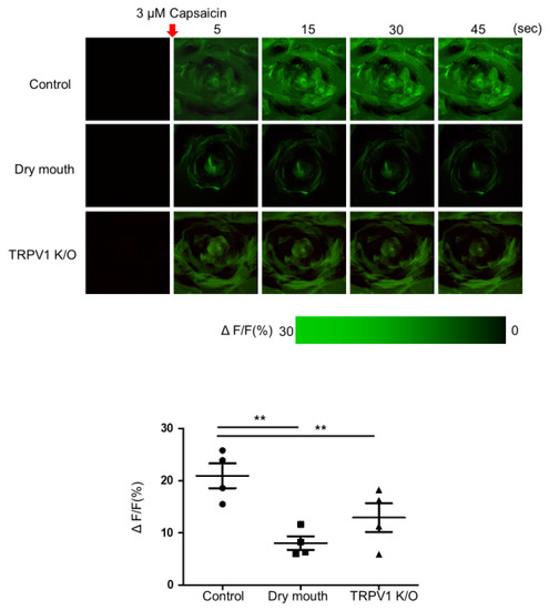 The following supporting information can be downloaded at: https://www.mdpi.com/article/10.3390/life13010075/s1, Figure S1: Genotyping PCR results of TRPV1 K/O mice. Figure S2: Scheme of calcium green loading for live imaging. Video S1: Live imaging of mouse tongue by two-photon microscope (A) Control; (B) Dry mouth; (C) TRPV1 K/O.