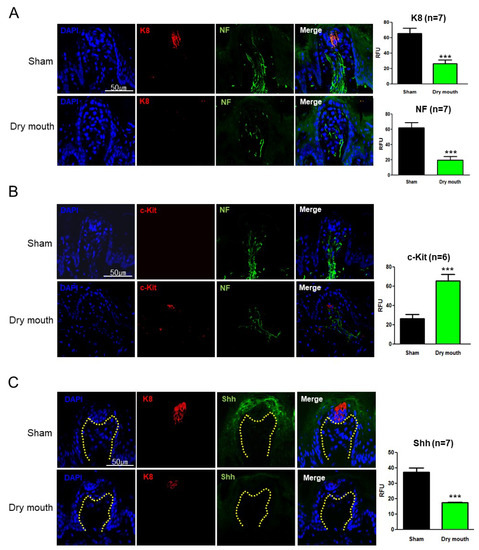 Shh/Gli signaling is important for taste bud development [28,29]. We hypothesized that the elevated c-Kit expression was associated with Shh and Gli1 downregulation in taste buds. In each figure, we have drawn dashed lines between the taste buds and chorda tympani nerve, thereby marking the epithelial border. Shh expression was restricted to nerve endings and taste buds in the dry mouth group (p < 0.001, F = 3.767; Figure 3C). When K8 was downregulated, Shh expression and localization were entirely consistent with those in K8-positive cells. The Gli1 expression in the dry mouth group was significantly lower than that in the sham group (p = 0.007, F = 1.527; Figure 3D). These results suggested that the decreased keratin expression in dry mouth is associated with perturbed taste bud maintenance and disrupted Shh/Gli1 signaling.