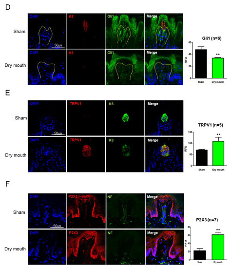 Taste buds contain neuroepithelial, neuroendocrine, neuromodulator, and chemoreceptor cells [9,10,11,12] since they have varying levels of epithelial, neuronal, and secretory properties. In addition, the distinctive cellular and molecular characteristics of taste bud cells suggest the presence of multiple stem cell types [13,14]. Impairment of parasympathetic innervation has been reported to decelerate progenitor cell differentiation in nerves [15,16]. Innervations are essential for gustation and taste bud cell maintenance, and hedgehog/glioma-associated oncogene homolog 1 (Gli) signaling plays a crucial role in this process [17,18,19,20]. Recent studies have reported that transient receptor potential vanilloid 1 (TRPV1) expression influences both postnatal and activity-induced neurogenesis during adulthood [21,22,23]. For example, neuronal TRPV1 promoted the release of bioactive neuropeptides from sensory fiber innervation organs [21,22], and TRPV1-immunoreactivity was detected in nerve fibers beneath the epithelium, and/or taste bud-like structure [23,24]. However, the role of TRPV1 in restoring taste bud function in individuals with dry mouth and its interaction with hedgehog/Gli signaling remain unclear.