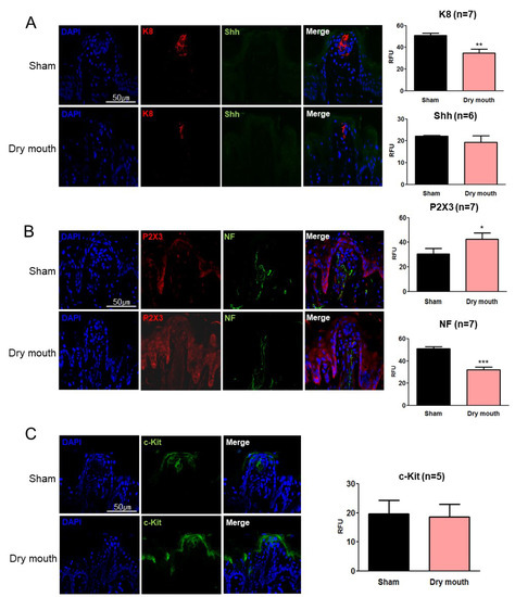To further assess the progression of taste bud disruption due to dry mouth syndrome, we analyzed K8 expression, which is essential for taste bud differentiation, and NF distribution, for studying innervation. The expression of K8, the epithelial cell marker on taste buds, in the dry mouth group was significantly lower than that in the sham group (p < 0.001, F = 1.804). NF retraction was also observed in the dry mouth group (p < 0.001, F = 1.840; Figure 3A). Furthermore, we studied hematopoietic stem cell factor (c-Kit), which is essential for taste bud development. The dry mouth group had significantly higher c-Kit expression than the sham group (p < 0.001, F = 3.308; Figure 3B). These results indicated that dry mouth induced the loss of epithelial characteristics, NF retraction, and c-Kit overexpression at the ends of NFs in the taste buds.