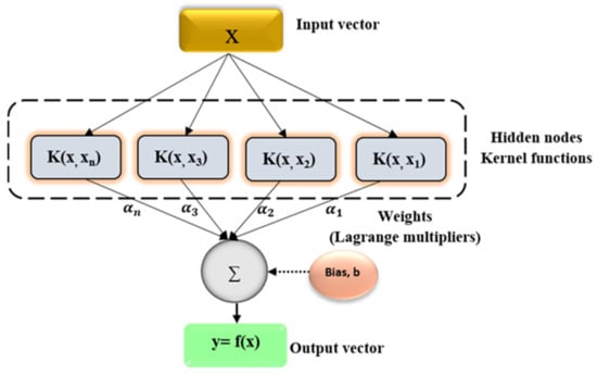 This model was developed based on the concept of support vector machine (SVM), which is generally used in solving problems through regression and classification approaches [9,20,21,22,23]. SVR is an established computational technique with various merits, such as good noise-toleration, superior generalization ability, and high learning speed [24]. Generally, the input variables from the datasets were mapped into a high dimensional feature filter architecture via a kernel operator using the SVR [24,25,26]. This regression technique has the ability of converting a non-linear problem into a linear problem via understanding the learning complexity of the relationship between the input and output variables [27,28]. The structure of SVM can be found in Figure 2.