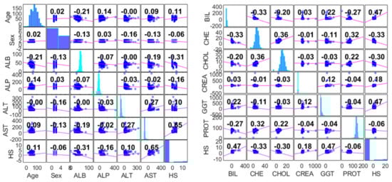 According to the correlation matrix shown in Figure 3, it can be seen that AST showed a strong correlation against the target hepatitis status, with the PCC-value equal to 0.65, while BIL and GGT showed relatively intermediate relation with the target, with both PCC values equal to 0.47. Moreover, all the other input variables depict a weak correlation, with PCC-value <0.4.