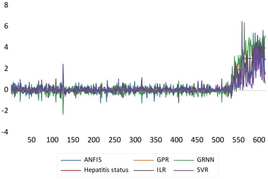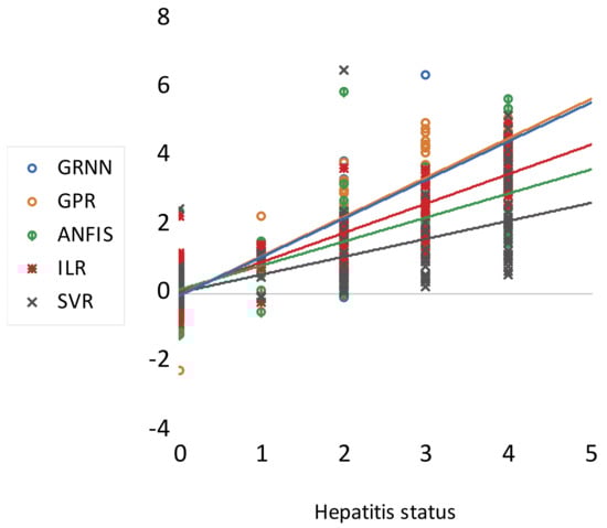 The need for understanding the science and knowledge of data is of paramount importance recently in medical informatics, CHI, and bioinformatics. The data used in the current study contains 615 observations with 13 attributes of the blood donors, subjects, and the hepatitis C patient’s laboratory, as well as demographic variables, which are composed of: age, sex, albumin (ALB), alkaline phosphatase (ALP), alanine transaminase (ALT), aspartate aminotransferase (AST), basal insulin level (BIL), cholinesterase (ChE), cholesterol (CHOL), creatinine (CREA), gamma-glutamyl transferase (GGT) and protein (PROT). In addition, the dataset is equally obtained from UCI Machine Learning, and for more detailed information, it can be found at https://archive.ics.uci.edu/ml/datasets/HCV+data, accessed on 6 October 2022. Moreover, five different single models informing on GPR, SVR, ANFIS, GRNN, and ILR were used in predicting the hepatitis status. These techniques were composed of four non-linear (GPR, SVR, ANFIS, and GRNN) and one classical linear method to inform of ILR. Furthermore, based on different researches depicted in the recent technical literature for simulation, modelling, prediction and forecasting, the AI-based models usually demonstrate higher performance than the classical linear method, as demonstrated by [16,17,18,19].