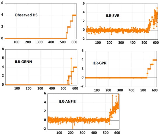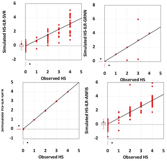 According to the prediction skills presented by the novel hybridized paradigms shown in Table 3, it can be seen that the proposed techniques were able to enhance the performance efficiency of the single paradigms up to 44% and 45% in the calibration and validation phases, respectively. Though all of the four proposed paradigms were able to predict the highly stochastic, complex, and chaotic HCV data in both the calibration and validation stages, the ILR-GPR and ILR-GRNN showed superior performance to the ILR-ANFIS and ILR-SVR, as shown in Figure 7 and Figure 8, respectively.