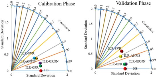 Taylor diagram performance of the novel hybridized techniques in both the calibration and validation steps.
