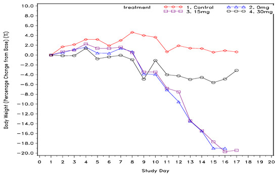 Pharmacological intervention with ketamine has not been proposed for the treatment of cachexia. The results indicated that ketamine was effective in slowing down weight loss due to cachexia, and ketamine was also an effective agent in improving overall survival. As shown in Table 1, The mock 0 mg/kg group had a reduction in body weight to 18.8 ± 1.4 g from the baseline (day 10) weight of 22.7 ± 0.5 g at the end of the study (day 17), with a loss of 4.0 ± 1.3 g or −17.4 ± 6.0% of the baseline weight. The low-dose 15 mg/kg ketamine group had a reduction in body weight to 18.3 ± 3.8 g from the baseline (day 10) weight of 22.1 ± 0.9 g at the end of the study (day 17), with a loss of 3.8 ± 2.9 g or −17.7 ± 13.8% of the baseline weight. The high-dose 30 mg/kg ketamine group had a reduction in body weight to 20.3 ± 1.8 g from the baseline (day 10) weight of 22.1 ± 0.7 g at the end of study (day 17), with a loss of 1.8 ± 1.3 g or −8.2 ± 5.9% of the baseline weight. The control group had a reduction in body weight to 21.0 ± 0.6 g from the baseline (day 10) weight of 21.9 ± 0.6 g at the end of study (day 17), with a loss of −0.8 ± 0.6 g or −3.8 ± 2.7% of the baseline weight.