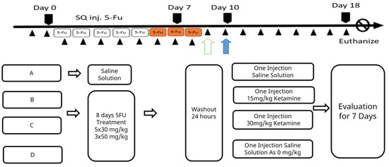 Except for the animals in the normal control group kept for background procedure checking, all other animals were subjected to daily subcutaneous injection (SQ inj.) of 100 μL of 5-fluorouracil (5-Fu™, F6627; Sigma, St. Louis, MO, USA). A daily dose of 25 mg/kg BW 5-Fu was administered for 5 days following a dose of 50 mg/kg BW that was administered for 3 days. After the 5-Fu induction treatments, the therapeutic ketamine counter measure was initiated and data were collected for 7 days until the humane endpoint. To comply with animal ethics and experiences from pilot studies, animal body weight was not allowed to decrease by more than 20% of the original body weight within a week of this regimen being applied. Minor distresses such as avoidance, reduced movement, and increased corner resting time, etc., were monitored. Diarrhea might occur and was apparent as feces stains on hairs around the anus, and this was considered a severe sign of animals being moribund. Specific care was provided with water moisture-softened feed. Individual water and feed consumptions were not recorded during specific care. The experimental timeline is shown in Scheme 1.