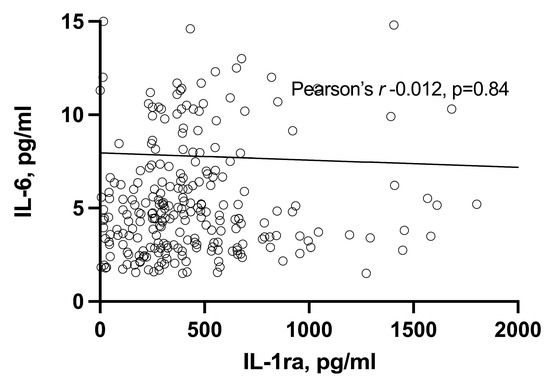 No correlation was found between serum levels of IL-6 and IL-1ra (Pearson’s r —0.012, p = 0.84) (Figure 1). This was also the case when patients were categorized according to disease activity, that is, based on disease activity score (remission, low, moderate, and high or very high) (data not shown).
